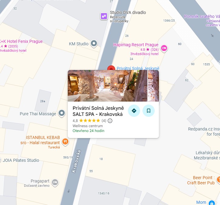 Salt Spa salt cave can be found near the MHD station - Můstek on Krakovská 22, Prague 1. Parking is available in the adjacent streets according to the parking tariffs of the given city district.